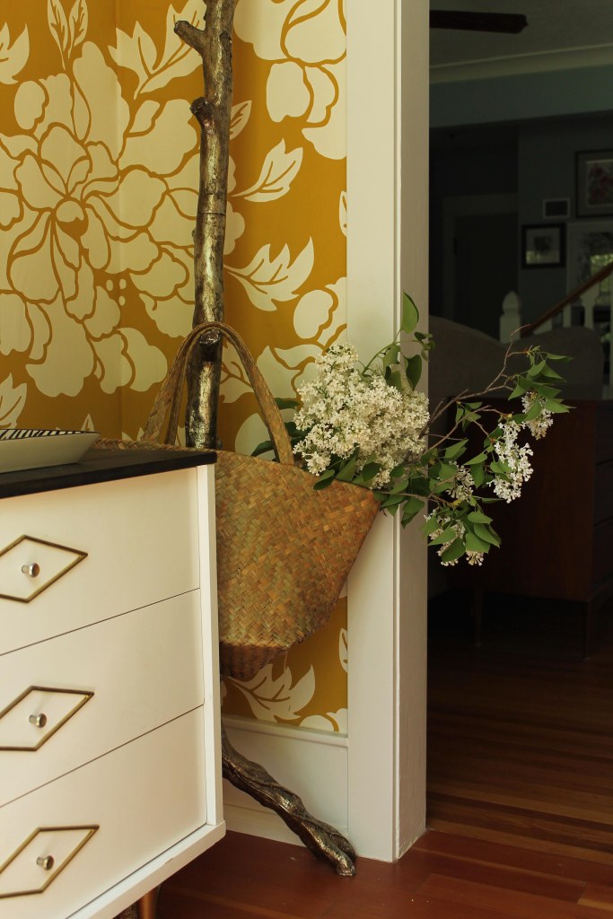 I love wallpaper in an entryway—in fact, I think all entries could benefit from a little pattern on the walls. That’s why I’ve had this paper hanging in my own entry for four years. It wasn’t easy to hang, but it makes me happy every day. I ordered it from Anthropologie, and although it’s been discontinued there, you can find it elsewhere online by searching “Paeonia wallpaper.” Are you noticing a “peony” theme?