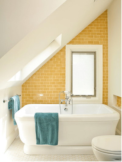 I was especially inspired by those last two images, and Lonnie and I just ordered the Mustard Bright tile below for our Jack-and-Jill bath for the kids upstairs. We are going neutral—black, white, and gray—in the main-floor powder room and master bath, but what better place to do something bold and fun than in a kids’ bathroom? I chose yellow specifically because I wanted my kids to start their day with a happy color, and yellow has to be the happiest.
