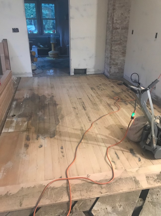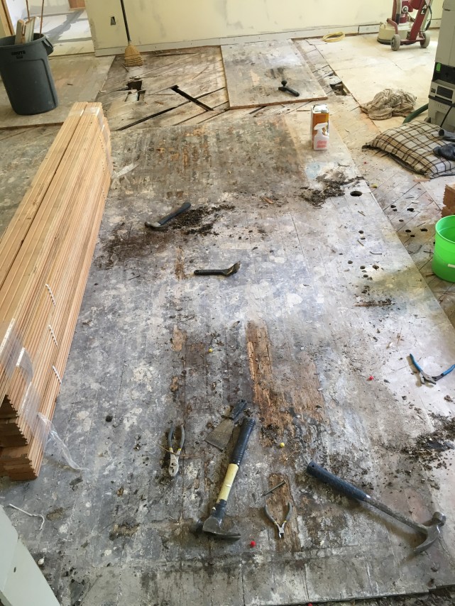 We also had to pull every nail, screw, and staple out of the floors, and there were so many. The ones that just would not come out we set deep in the wood to not interfere with the sanding.