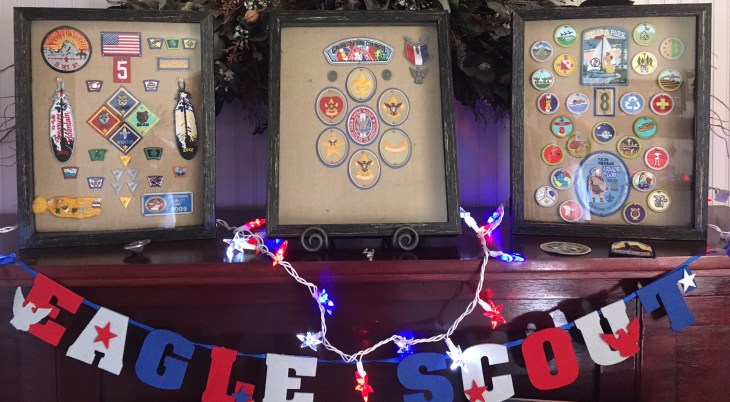 My friend’s son recently earned his Eagle Scout recognition, and rather than stitching all those merit badges on a sash or his scout shirt, she picked up three shadow boxes and tacked them inside.