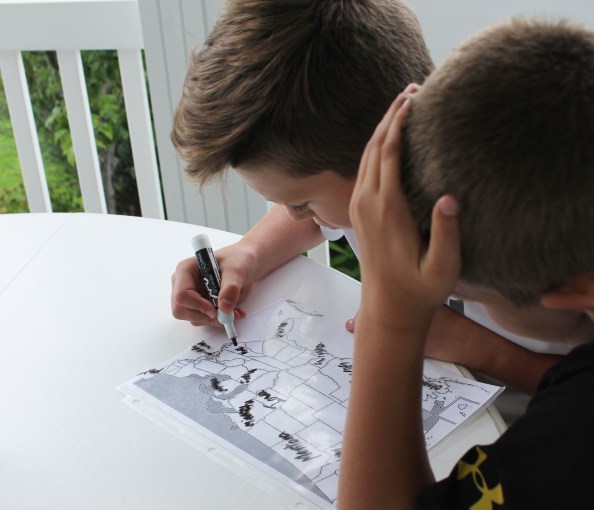 I printed copies of a United States map that only showed state boundaries, and I put these in plastic sheet protectors. Each boy got a dry-erase marker and would label as many states as possible (and could easily erase the page after every use).