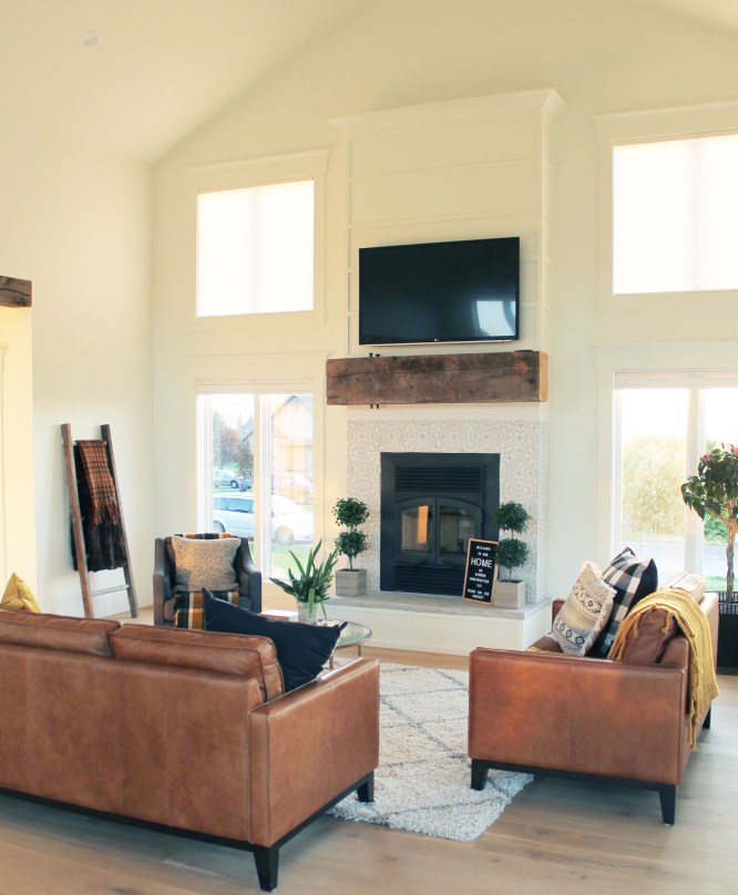 First up, the two largest homes I visited had similar finishes—lots of tans and browns, rock outside, stain-grade trim, and beams inside. These are pretty typical choices for east Idaho.