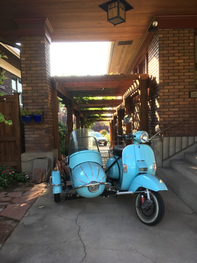 And if you’re going to live in one of these houses, you better be driving the cutest bike on earth. Notice the row of arbors leading to the back yard too.