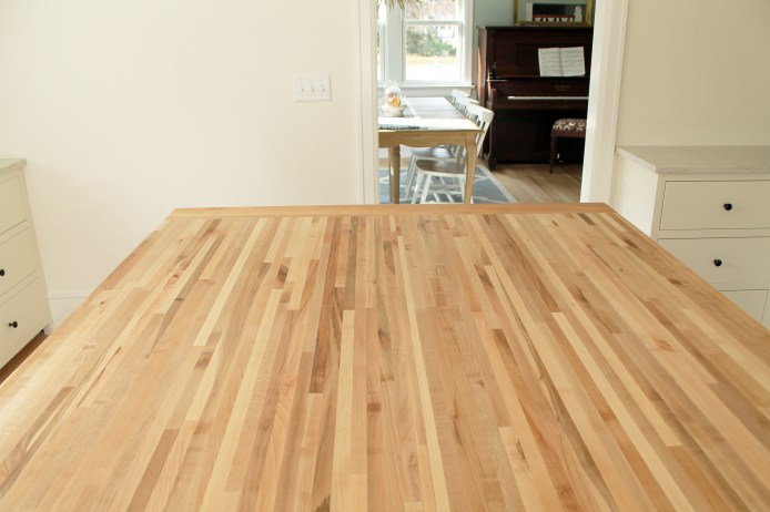 We chose butcher block for the island, and I highly recommend it. The kitchen feels so much warmer with that big expanse of wood. For a more custom look, our contractor recommended butcher-block ends (see how the short end has a piece of wood running the opposite direction?), and he was right. It looks good.