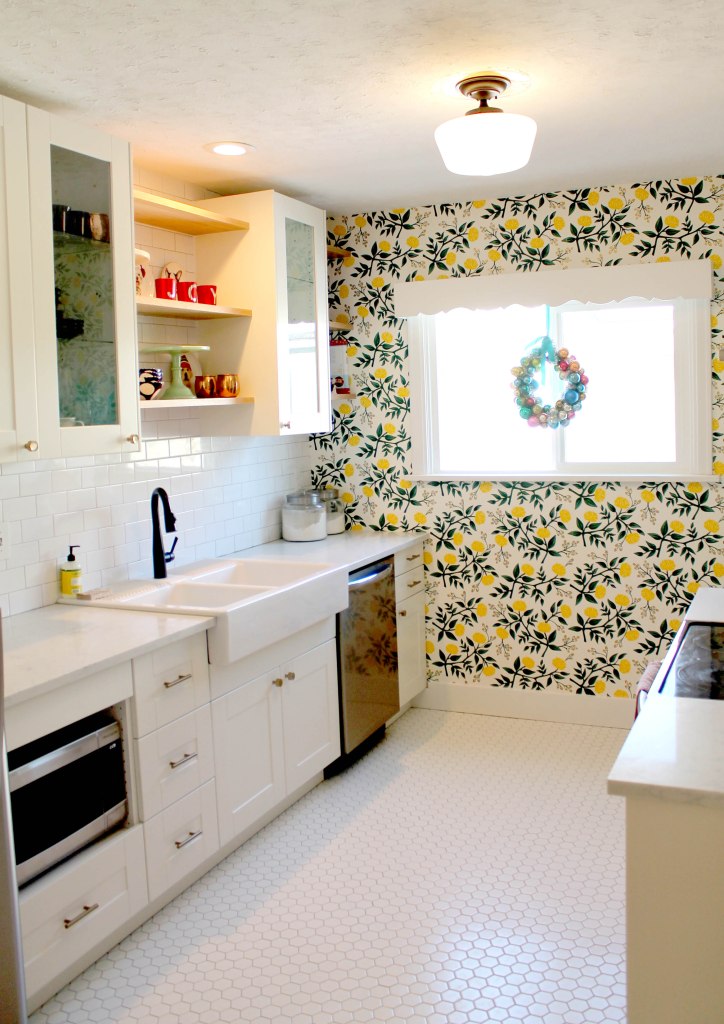 My sister just remodeled this kitchen in her 1930s Tudor Revival. Amazing Rifle Paper Co. wallpaper, right? And you can’t go wrong with a hex floor.