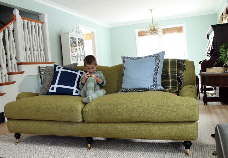 Next, I ordered five free swatches. I chose four green ones and a gray (just in case the greens were no bueno). Although I originally wanted a velvet sofa, I chose a tweedy, mossy green after seeing the swatches in real life. (Just as an aside, I still love velvet furniture, but tweed seems like more of a four-season fabric to me. I can always add velvet pillows during the winter anyway.) The fabric I chose is Lawn, “a slubby, woven blend that forms a unique and sturdy texture,” so says the website. Sturdy is key with four kids.