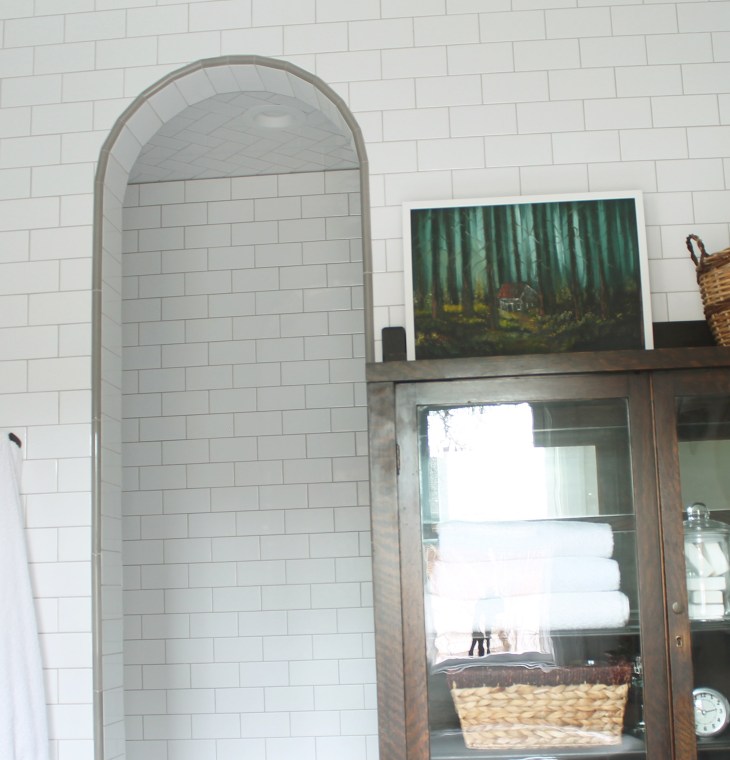 The arched shower was a must and was the starting point. We love the gray pencil tile that lines the opening. There is no shower curtain and no glass door, and we don’t plan to add either.