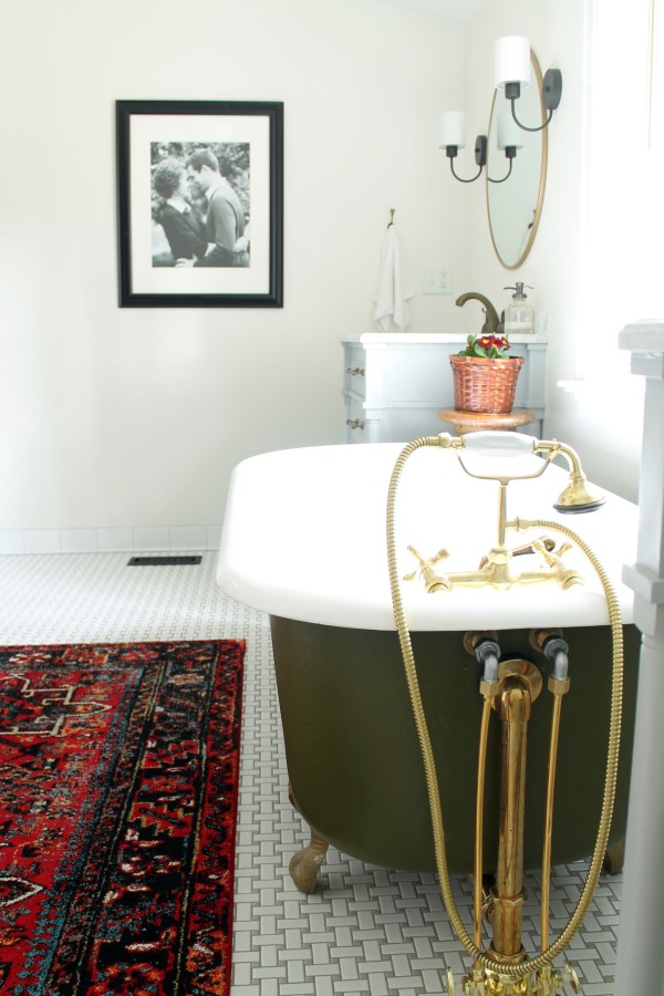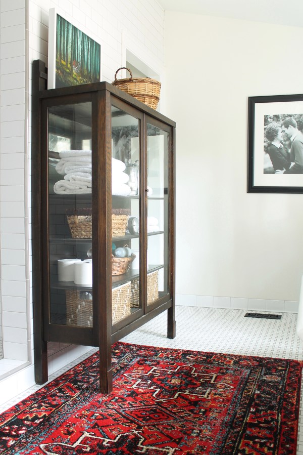 My favorite thing in the space is this circa-1910 cabinet we use as a glorified “closet.” I’m going to talk more about it in another post, but it suuuure is a pretty way to store the bathroom essentials. The rug warms up the space and makes it feel more like a room than a bathroom.
