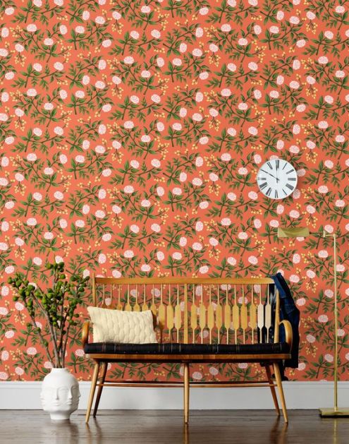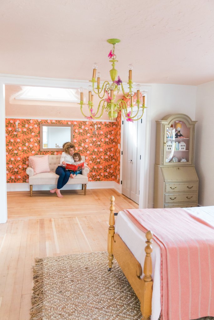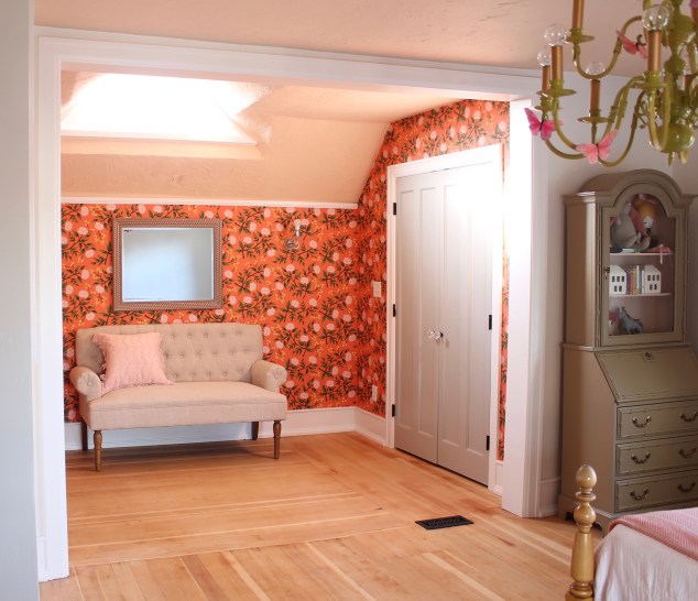 So that’s what I was starting with: One space wallpapered in super-saturated colors and one space with white walls and a light-pinkish ceiling.