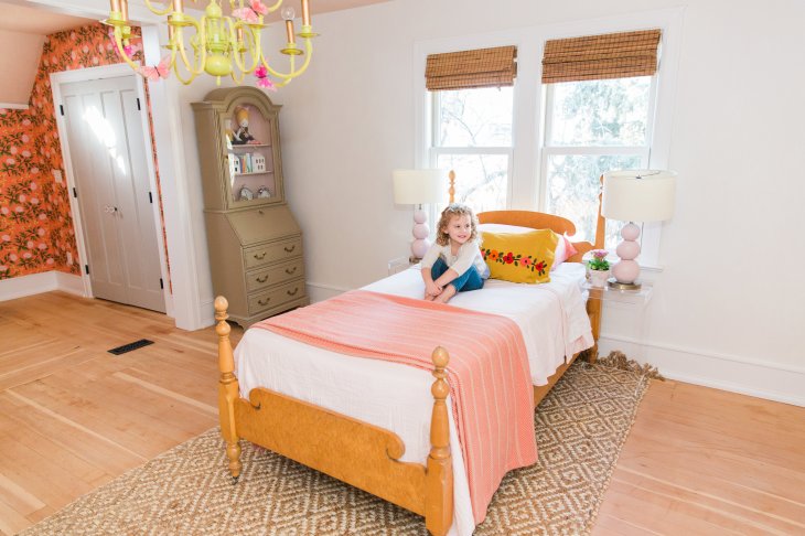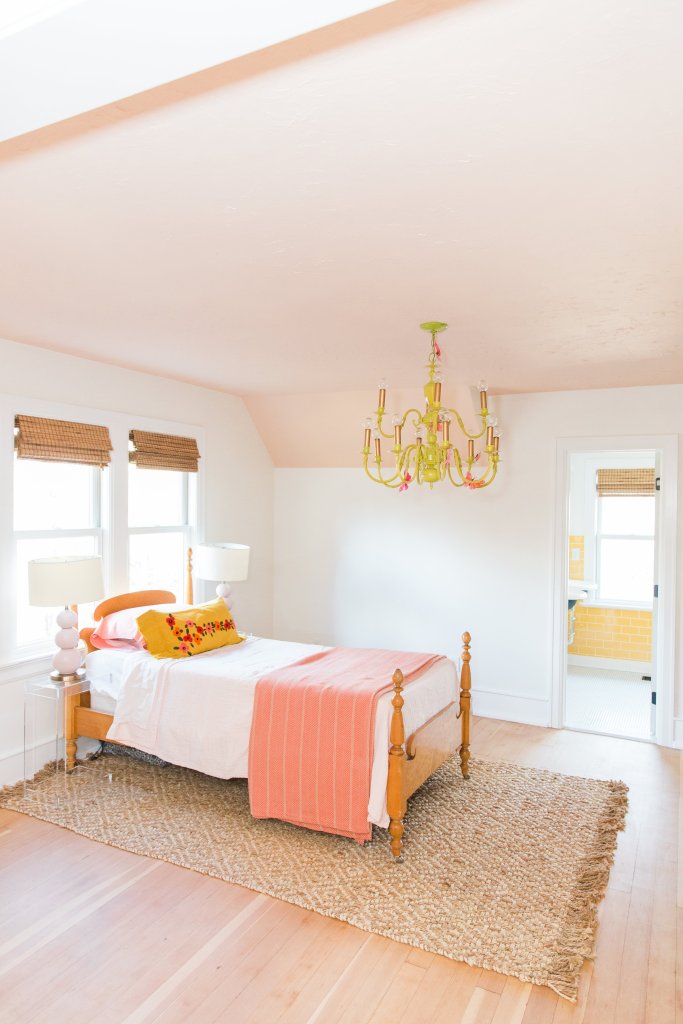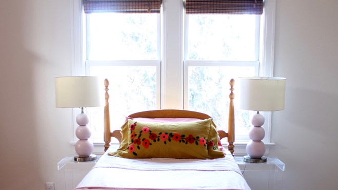 I stitched up a peach-polka-dot pillowcase. I added a coral herringbone blanket to the foot of the bed. And I used a beautiful embroidered linen from an estate sale to make a lumbar pillow that feels a little edgy and bohemian. Now the room was working better.
