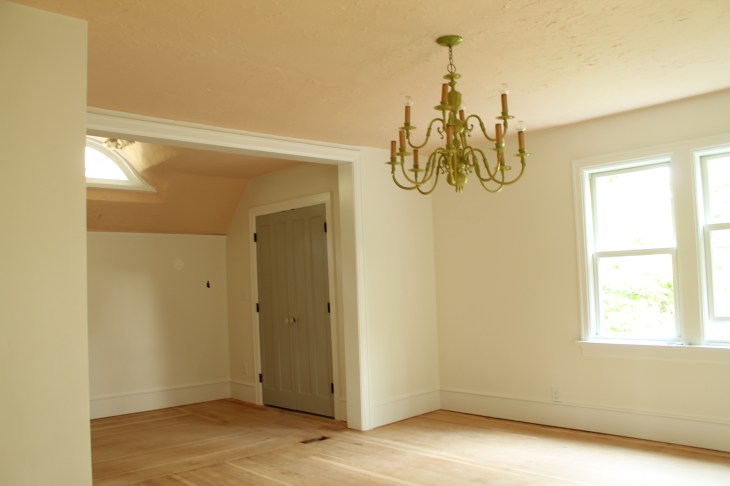 Here it is all clean and fresh with floors refinished, walls painted, and new windows and trim installed. It’s such a fun size and shape, and it’s easily the biggest bedroom in the house.
