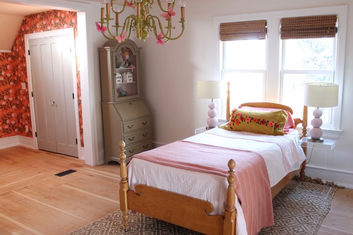 Anyway, her room feels almost like two rooms connected—a main part of the room with a smaller cased-in space at one end. The smaller space has two enormous closets, a real oddity in a house like ours. Her room adjoins the bathroom. I’ll be honest, she has a pretty sweet set-up.