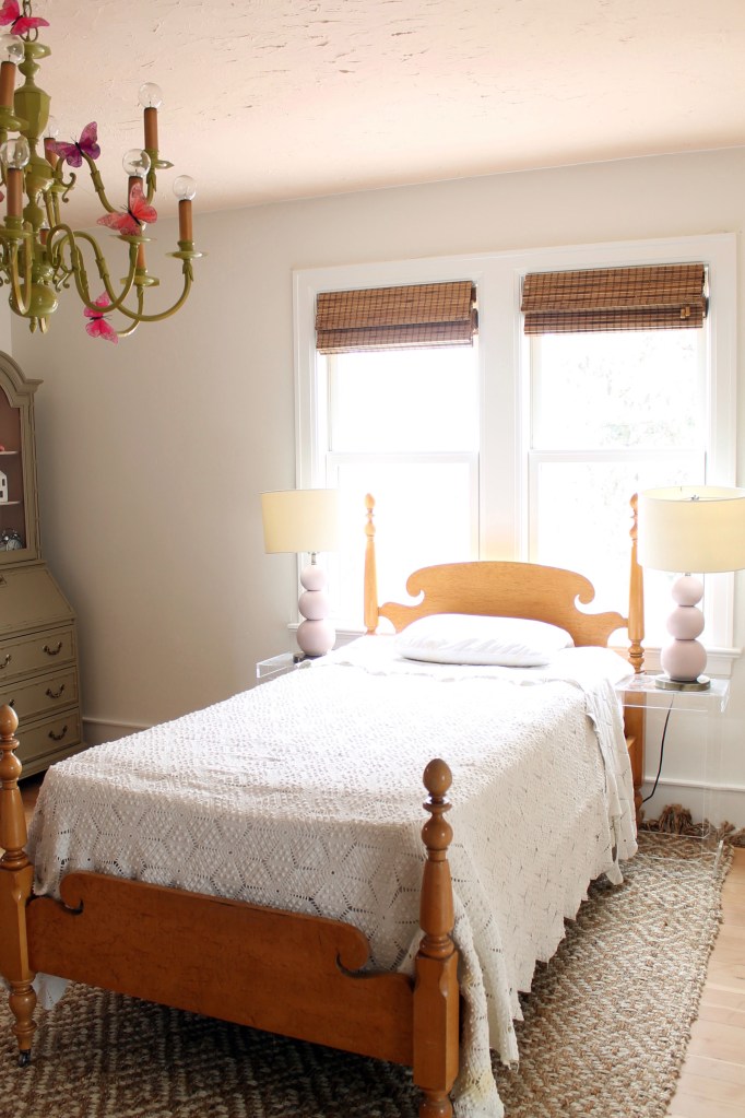 Then the difficulty began. All along I thought I’d use white bedding. You can’t go wrong with white bedding, right? It’s a classic. I planned to use an old, beautiful blanket that belonged to my great-grandmother. But when it was on the bed, the whole room just seemed … out of balance.