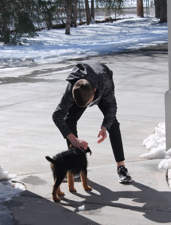 But it’s fun too. We picked up our Airedale puppy Saturday evening, then drove four hours in a snowstorm to get home. He did great in the car, and he’s really loving me.