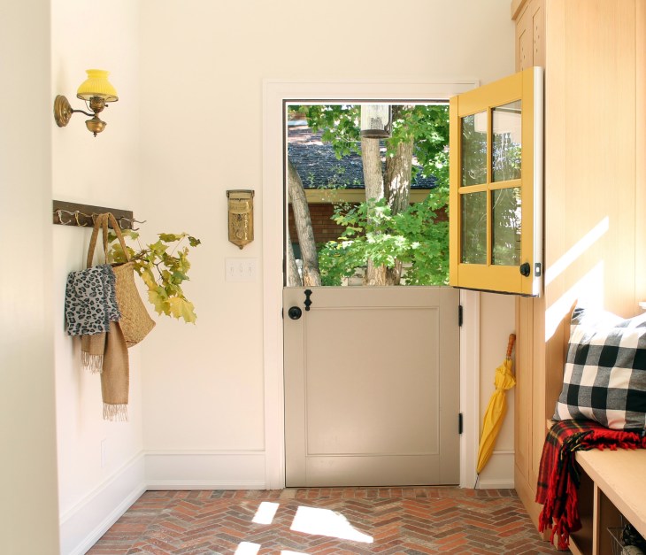 We had the paint matched at Home Depot, and it’s been on our front door ever since. It’s now on our Dutch door in back too, and I’ve had a few friends ask for the formula for their own doors on new construction. These shots will give you an idea of how this yellow looks with a couple other exterior colors: