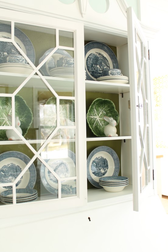 The only other new Easter decorations are these cabbage-shaped bowls in the secretary desk. They seemed a good match for my favorite bunnies one of my best girlfriends gave me 15 years ago.