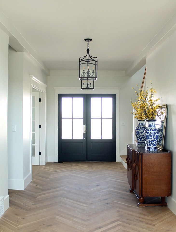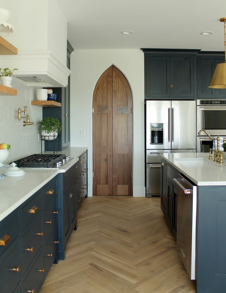 We kept things minimal decor-wise so you see the craftsmanship of the cabinets, herringbone floor, and trim. And how about those Gothic doors to the pantry? I love stained-wood doors of any kind, but these are bonkers.