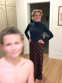 I’m thinking about coordinating outfits because we need family photos for our Christmas card (check out my tips for cute envelopes here). I only need one more thing—a turtleneck for my daughter—and we’ll be good to go. I bought a plaid skirt for myself at an estate sale last summer, and it’s perfect for Christmas. I think it cost two bucks or something crazy like that.