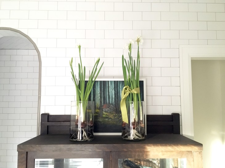 I planted paperwhites a few weeks ago, hoping they’d be in bloom for the Historic Homes for the Holidays tour. But these bulbs were overachievers and started blossoming three weeks after they were planted. I’m sure they’ll be spent by tour time, but I am enjoying them nonetheless—although they smell just like lilies, and I’m not a fan of the scent.