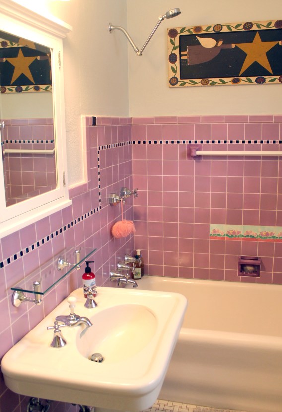 An original—and fabulous—lavender bath. Even the basket-weave tile is lavender.