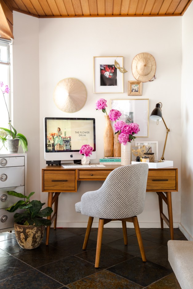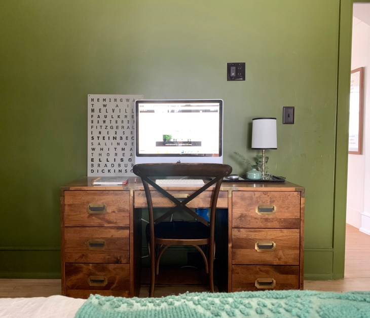 This is where I do a LOT of computer work. I love this campaign desk and scooped it up at a thrift store last year for about $75. The color works well in my room, but I would like to “style” the space.