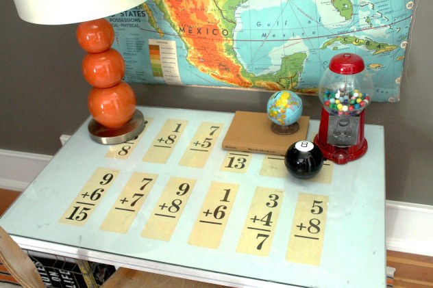 Well, that wasn’t rocket science, but it sure is a fun way to change up a desk in less than one minute. In the past we had vintage math flashcards under the glass, and now that the desk is in my daughter’s room, we used pages cut from an old calendar of flowers.