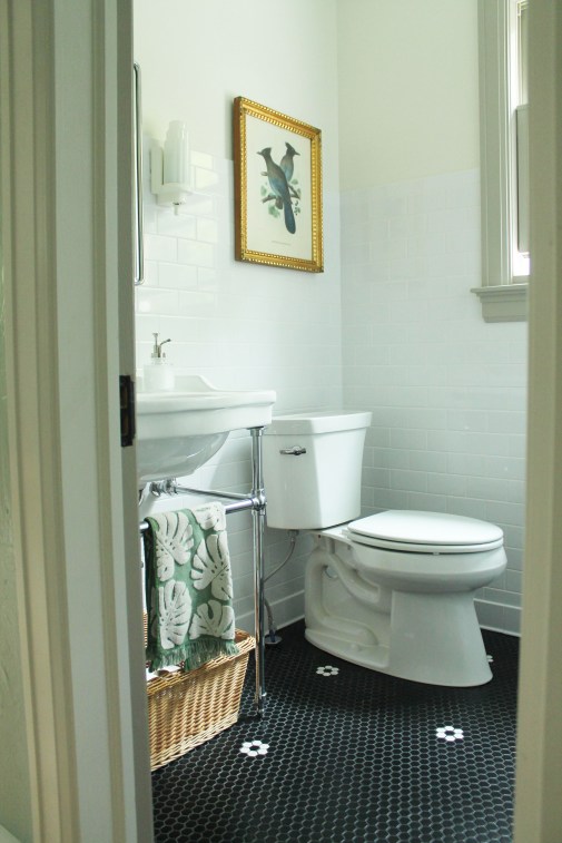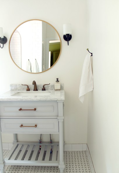 White paint in the half bath. I knew when the walls in the powder room were painted, they were too yellow. Next to pure-white subway tile, it’s especially obvious. But I reasoned, “It will grow on me. It will look different with ‘stuff’ in the room. I like mixing whites.” And I do like mixing whites, but some days I wish I would have just eaten crow and repainted back when I knew it wasn’t quite right.