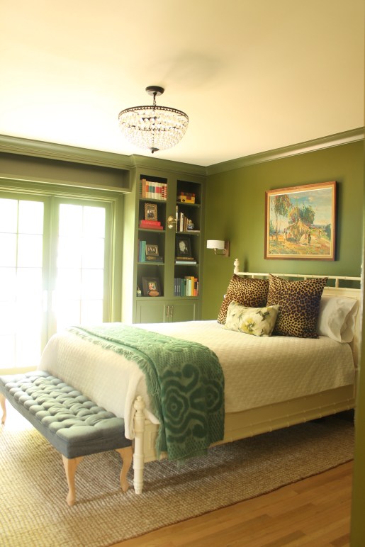 Green bedroom with painted trim to match. Another decision that had people raising their eyebrows was painting our master olive green. And it’s not just on the walls; it’s on the trim, doors, and built-ins. BEST DECISION EVER. Our bedroom is cozy like a cocoon.
