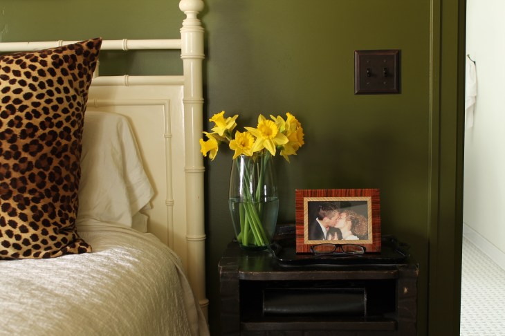 Olive is neutral enough to look good with pretty much any color. If you are gutsy and want to make your bedroom feel rich beyond belief, choose a dark color you love and apply it to every surface. You will not regret it!
