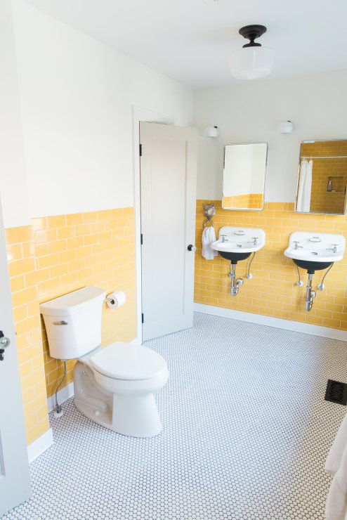 Same goes for the yellow tile in the kids’ bathroom. It is the truest school-bus yellow out there, but it is such a happy color. I love that my kids start the day with a shot of sunshine. No regrets there.