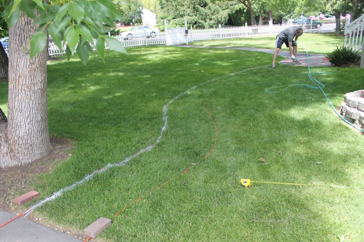 Figure out exactly the shape and direction of the path. To mark ours we used extension cords, then spray-painted along the cords so we’d know where to cut. The extension cords added another bonus: After we got the shape of the path just how we wanted it, we needed to figure out how many bricks to buy. So we stretched that curved length of cord straight and measured its length. My husband figured out how many bricks were needed using math I can’t explain, so get a math-inclined person to help you with this. We ended up three bricks shy — pretty close to right on, I’d say.