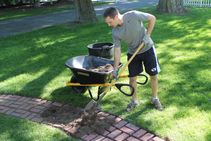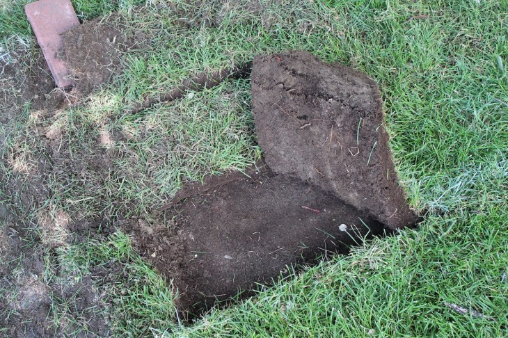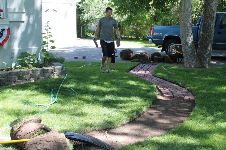 At my dad’s suggestion we rented a sod cutter, and I would recommend that too. It cost $35, left really nice finished edges, and adjusted easily to the depth we wanted (which was the brick height). However, because we are not handy, we had a heck of a time getting the thing working. I highly recommend watching an online tutorial for “how to use a sod cutter” before and after renting one. Once we figured it out, the work was done in five minutes. But it took us 90 minutes to look it up on YouTube.