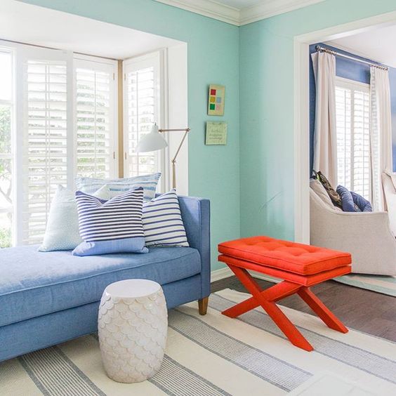 But they fit well with my color scheme, which was cornflower blue with robin-egg blue. It’s a beautiful combo inspired by Pencil Shavings Studio. I stitched up a couple pillows for the sofa.