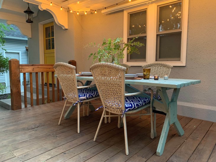 We hung hooks for a projector screen under the eave so we can watch movies out here at night. We are loving it! During the winter, we’ll store the screen inside until better weather comes around. You can see the projector screen in the photo below (just above the windows):