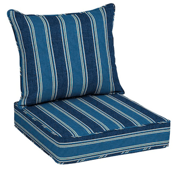 To mix up the look between chairs and sofa, I bought striped cushions at Lowe’s, and while pretty, they’re slouchy already.